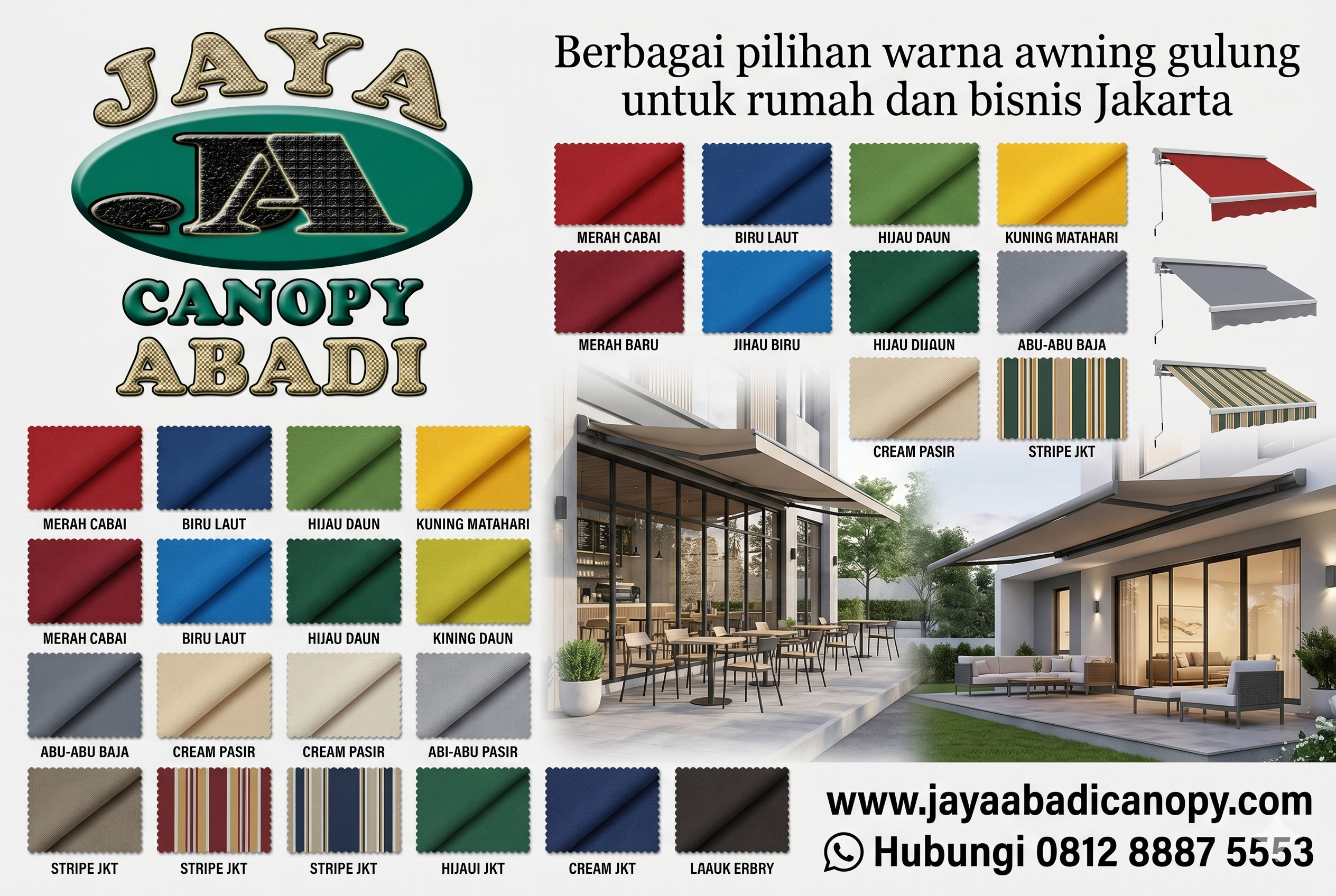 3. Pilih Warna yang Tidak Cepat Kotor Jakarta memiliki tingkat debu yang cukup tinggi. Jika Anda memasang awning di pinggir jalan raya, pilihlah warna-warna gelap atau motif garis-garis (stripes) untuk menyamarkan noda debu sebelum jadwal pembersihan rutin tiba.