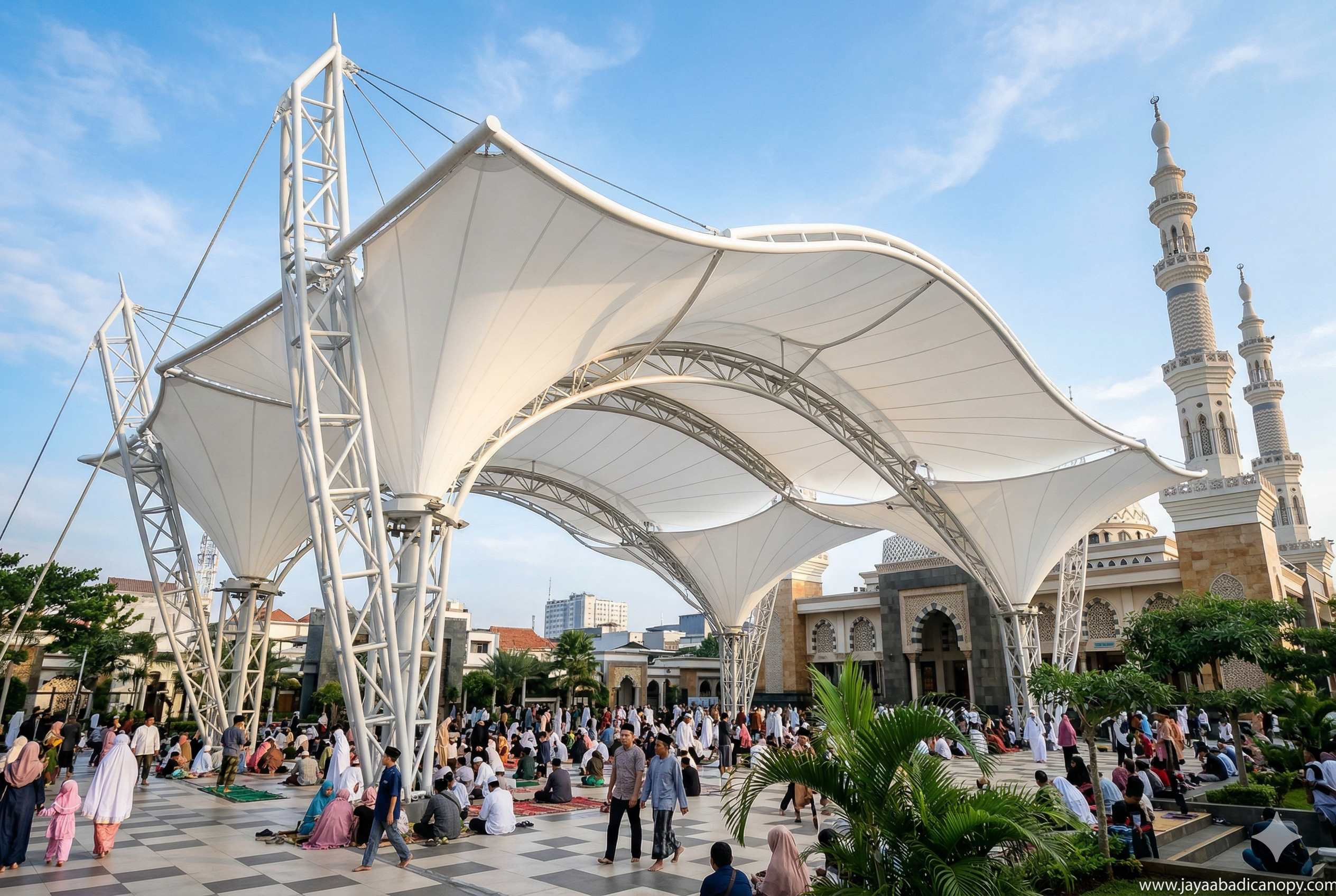 2. Desain yang Fleksibel dan Artistik Arsitektur masjid biasanya memiliki ciri khas tersendiri, seperti kubah atau menara. Kanopi membran memiliki sifat elastis yang memungkinkan kontraktor membentuknya sesuai dengan estetika bangunan. Anda bisa memesan bentuk kerucut, melengkung, atau bahkan menyerupai payung raksasa seperti yang ada di Masjid Nabawi.