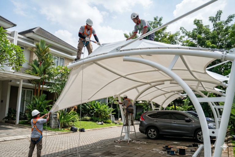 Selain itu, karakter cuaca di Yogyakarta yang kadang sangat terik dan tiba-tiba hujan deras menuntut material atap yang tangguh. Canopy membrane hadir sebagai solusi yang mampu meredam panas matahari sekaligus mengalirkan air hujan dengan sangat efisien. Bagi pemilik usaha kuliner atau penginapan di Jogja, memasang canopy membrane adalah investasi gaya hidup yang sekaligus meningkatkan kenyamanan pengunjung.