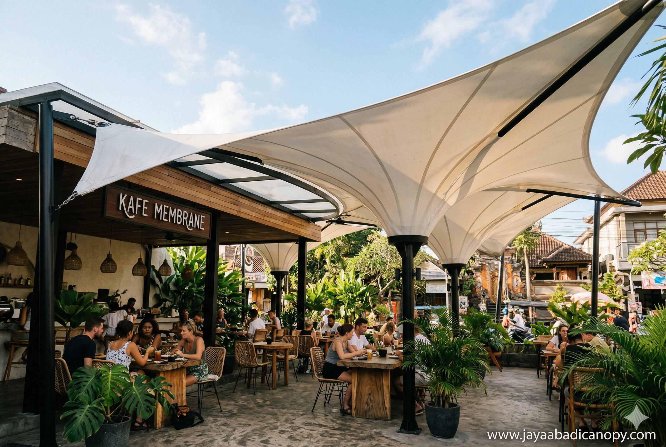 Di sinilah peran penting canopy membrane. Berbeda dengan kanopi konvensional yang kaku, membran menawarkan fleksibilitas desain. Anda bisa membentuknya sedemikian rupa sehingga mengikuti karakter atau branding cafe Anda. Selain itu, bahan membran memiliki kemampuan memantulkan panas matahari namun tetap membiarkan cahaya alami masuk secara lembut (transparan). Hasilnya, area di bawahnya terasa sejuk dan terang tanpa perlu lampu tambahan di siang hari.