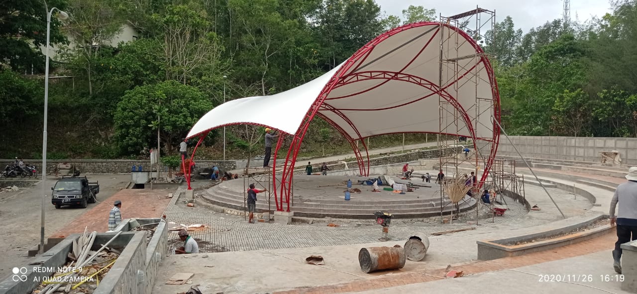 Tahap terakhir adalah instalasi. Tim ahli akan merangkai besi dan membentangkan kain membran dengan teknik penarikan (tension) yang pas agar kain tidak kendur dan tetap kokoh diterjang angin kencang.