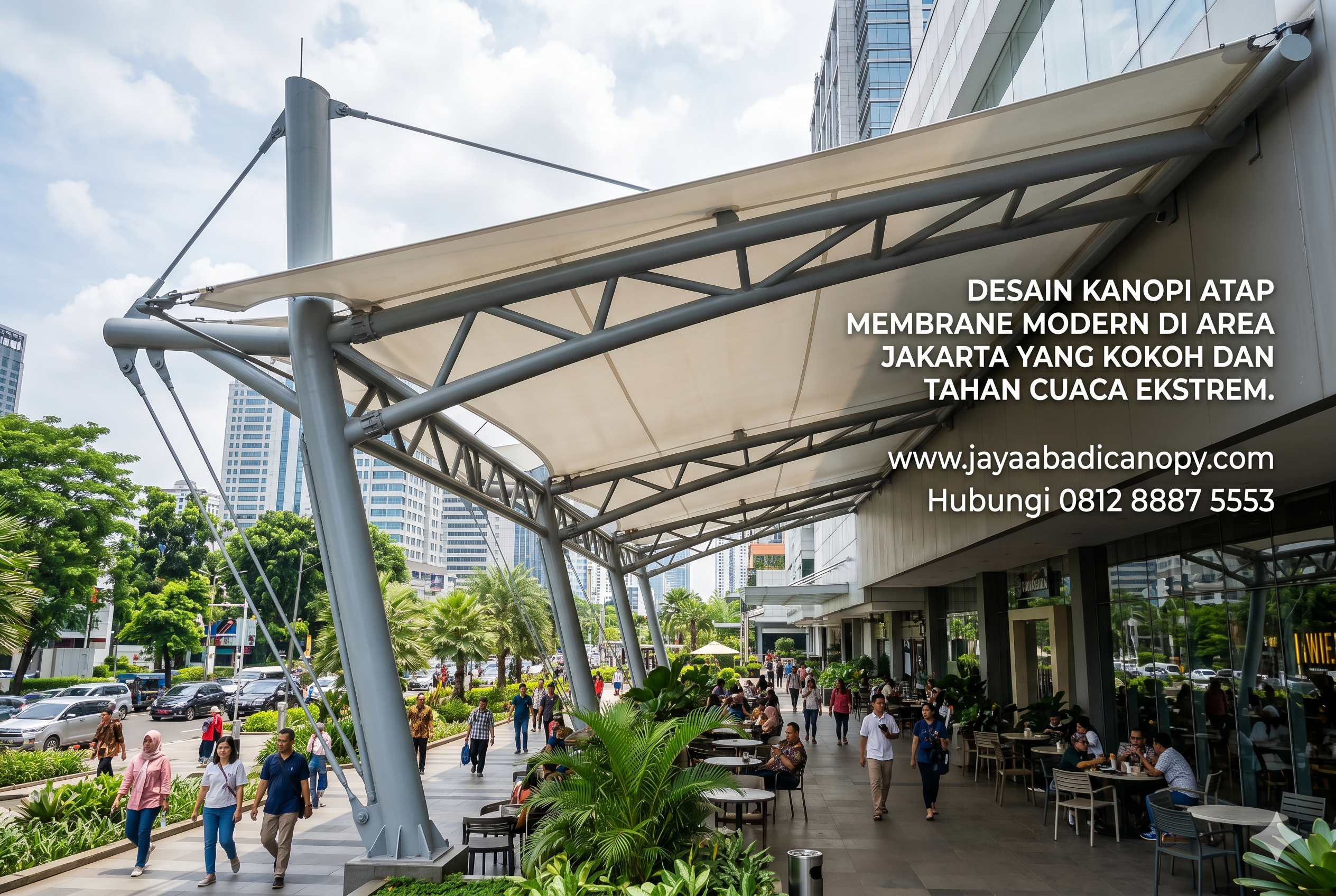 Cuaca di Jakarta Pusat seringkali terasa sangat menyengat karena pantulan panas dari beton-beton gedung tinggi. Material membrane memiliki kemampuan memantulkan sinar ultraviolet (UV) dengan sangat baik. Saat Anda berada di bawahnya, udara akan terasa jauh lebih sejuk dan nyaman.